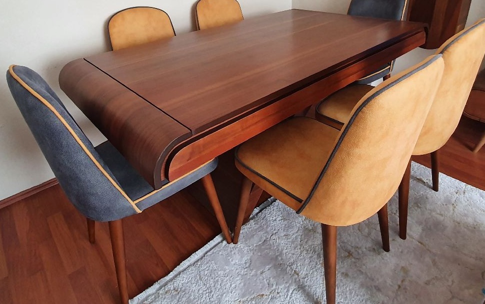 kendine ait orjinal sandalyeleriyle birlikte satılıktır. az kullanılmış ceviz yemek masası. toplam 6 adet ahşap sandalyesi vardır. söz konusu sandalyelerin tamamı tertemizdir. hiç birinde en ufak bir sorun bulunmaz.